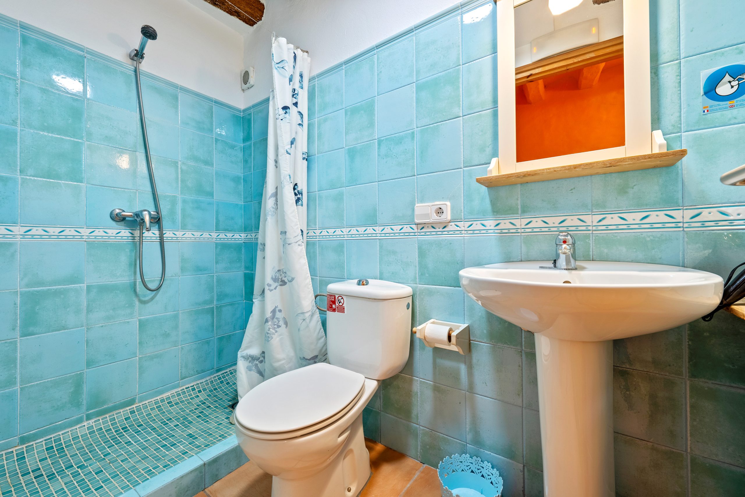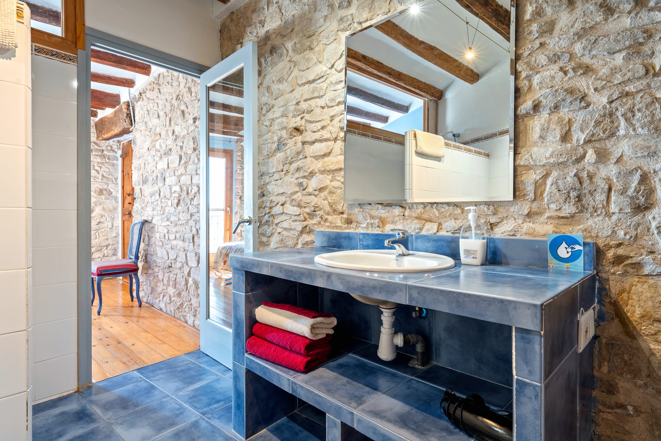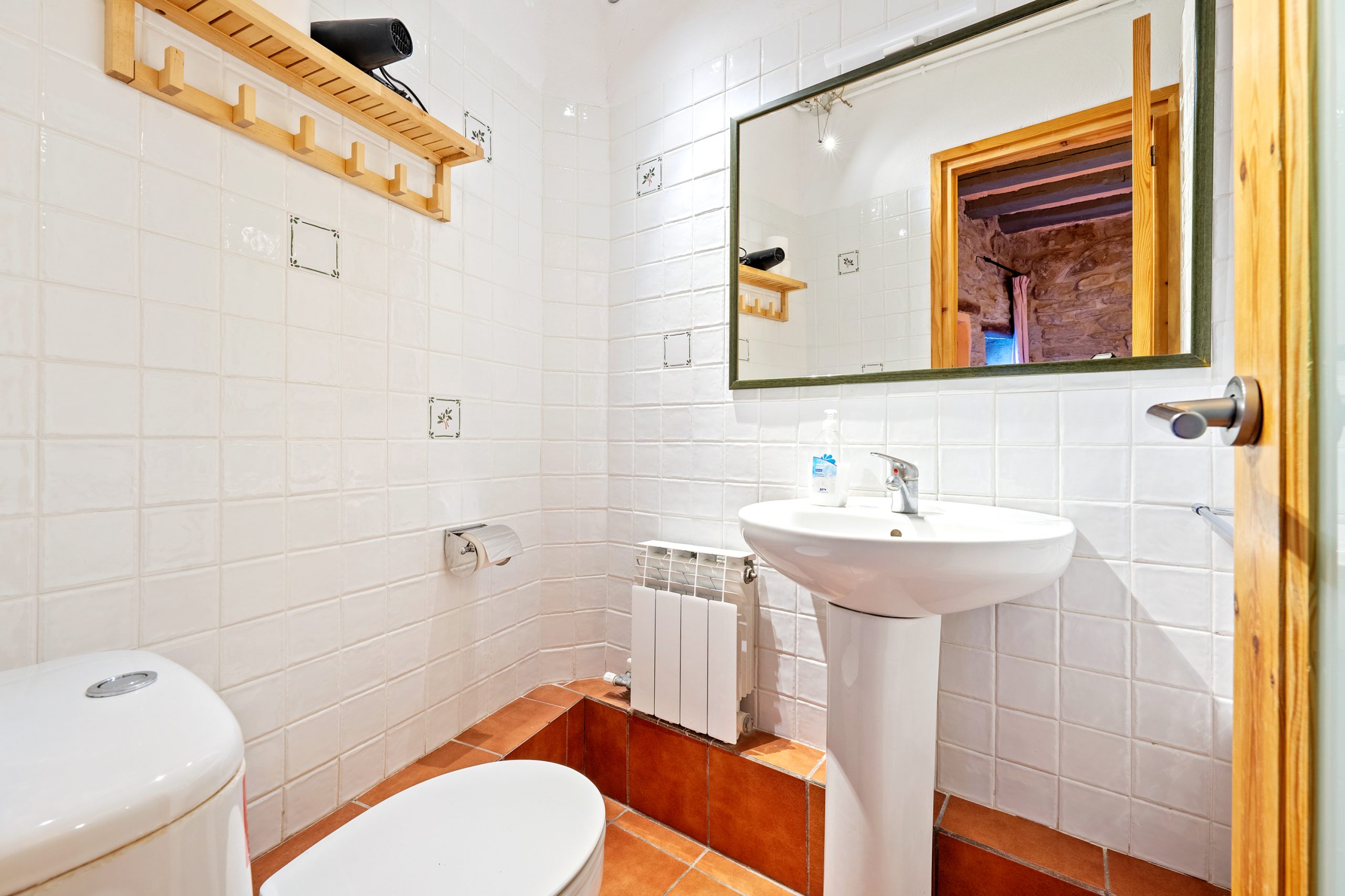 Para encontrar las demás habitaciones hemos de volver al recibidor, de donde sale una escalera de piedra que baja hacia abajo y encontramos a izquierda y derecha las habitaciones restantes, dos de ellas tienen baño dentro y las otras dos comparten uno.