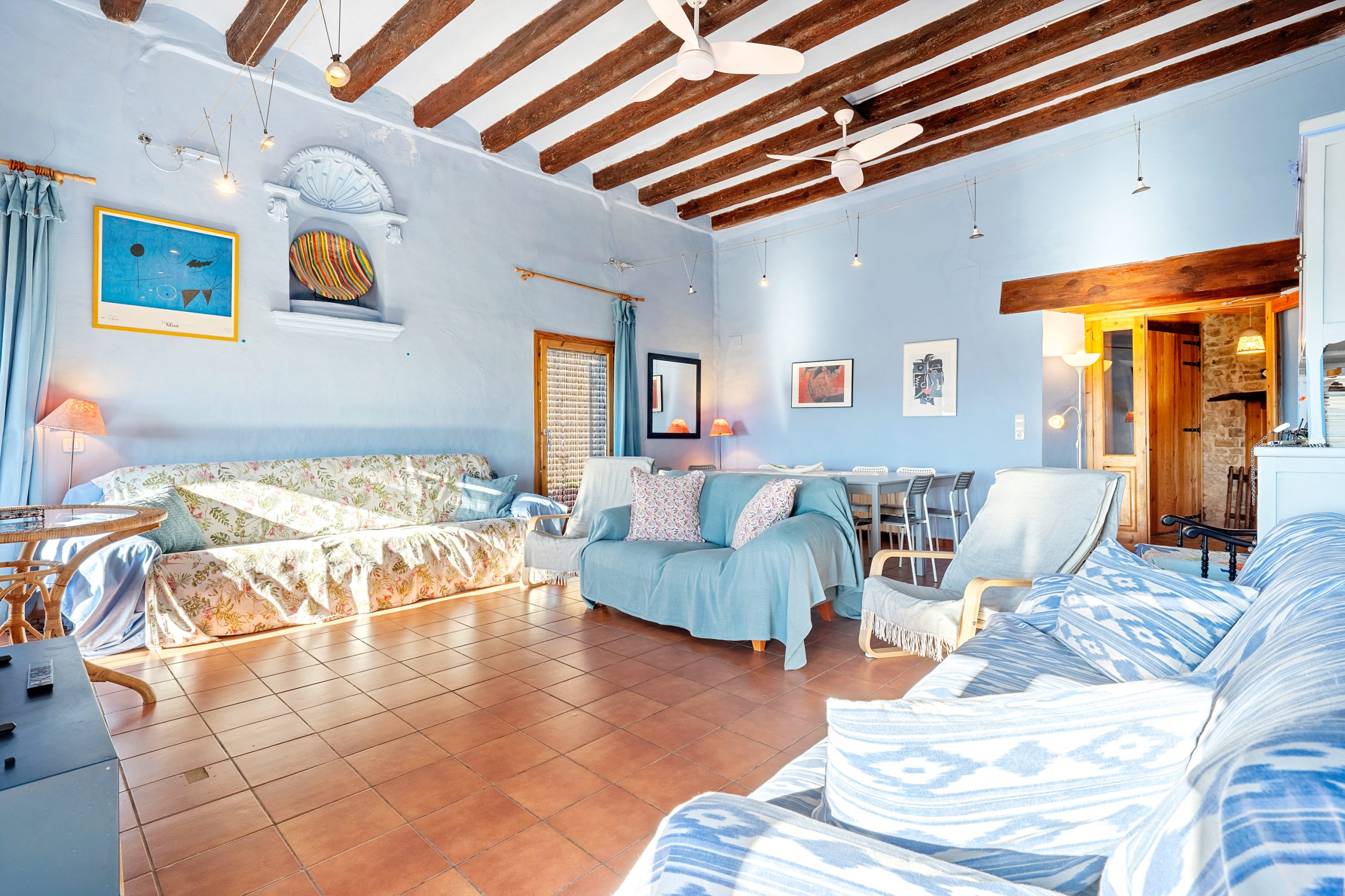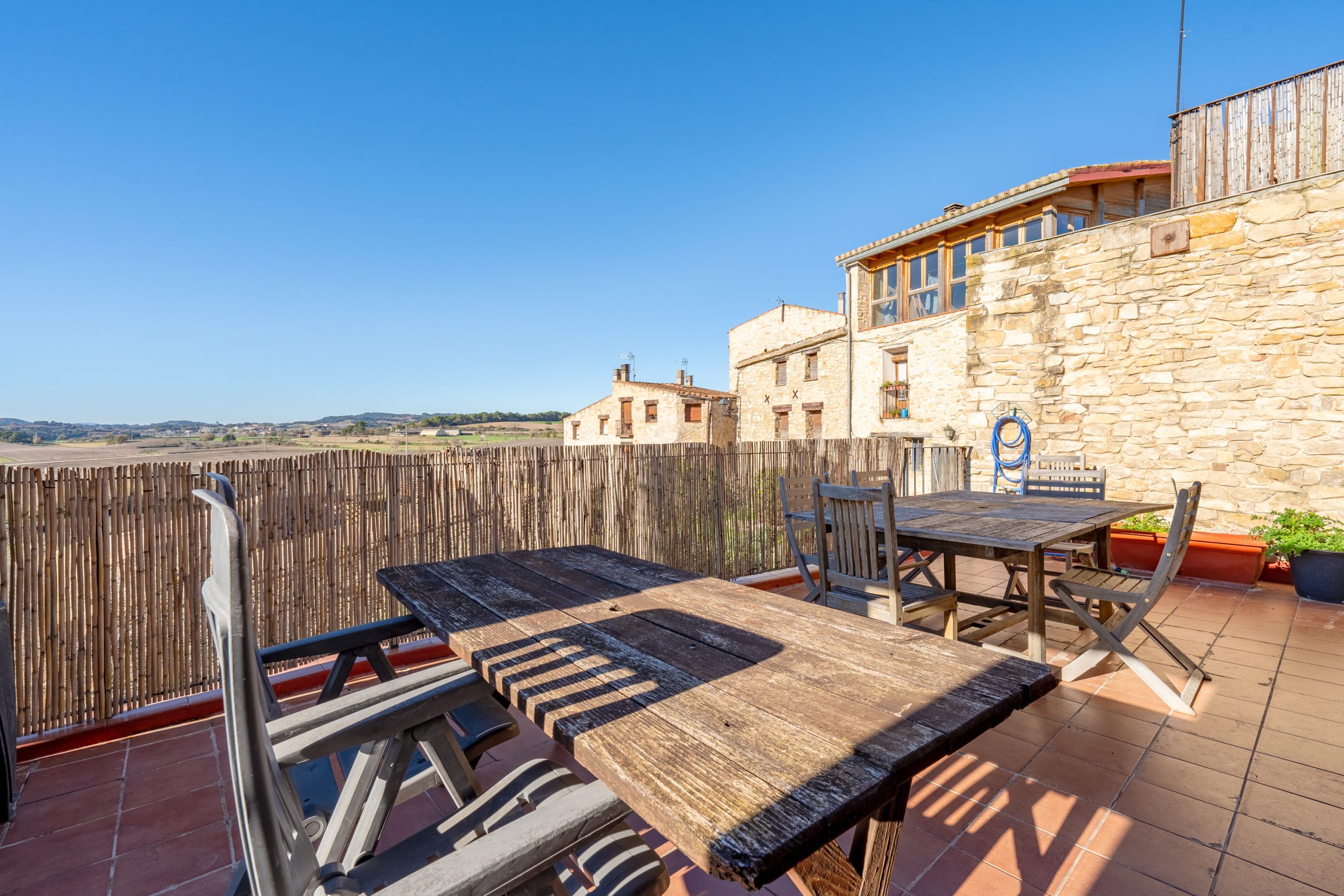 La casa está situada en una colina en Guialmons, entre campos de cereales y con la serra de Queralt y del Montclar en el fondo. Es un espacio tranquilo y silencioso y aunque en verano hace calor, la subida de la ’marinada’, y el clima mas bien seco, hace que se pueda estar muy a gusto.
