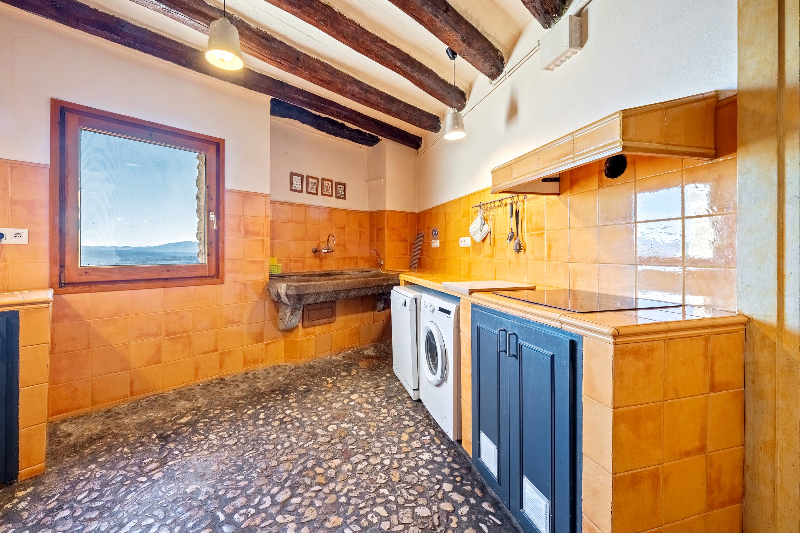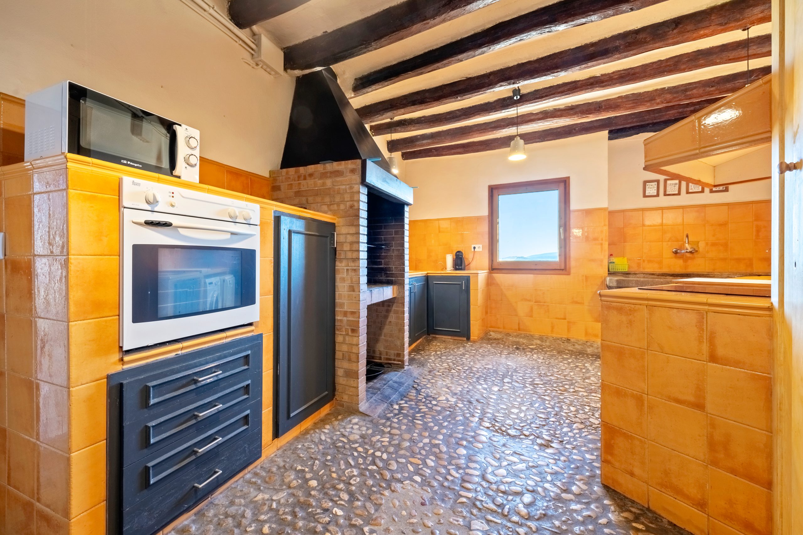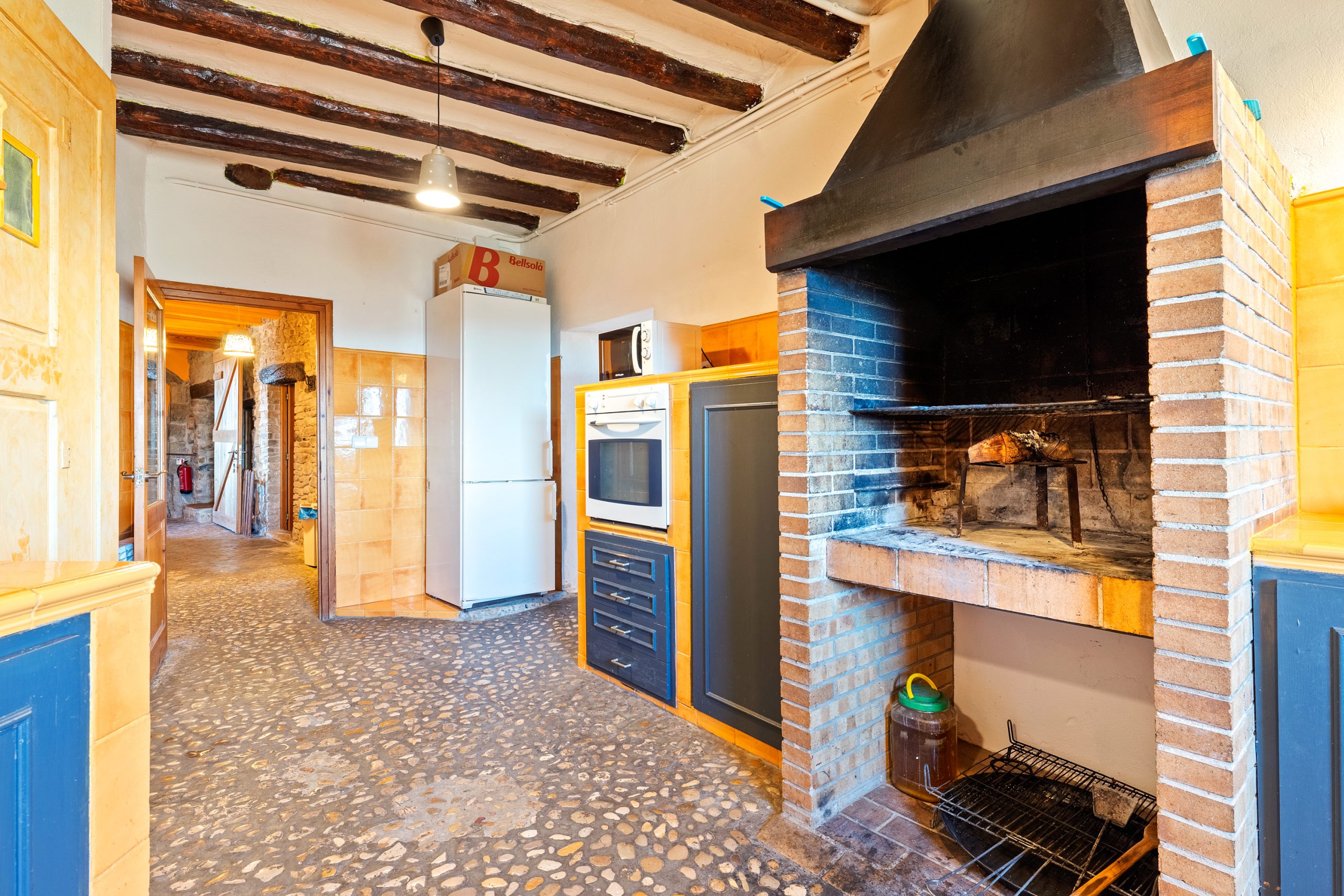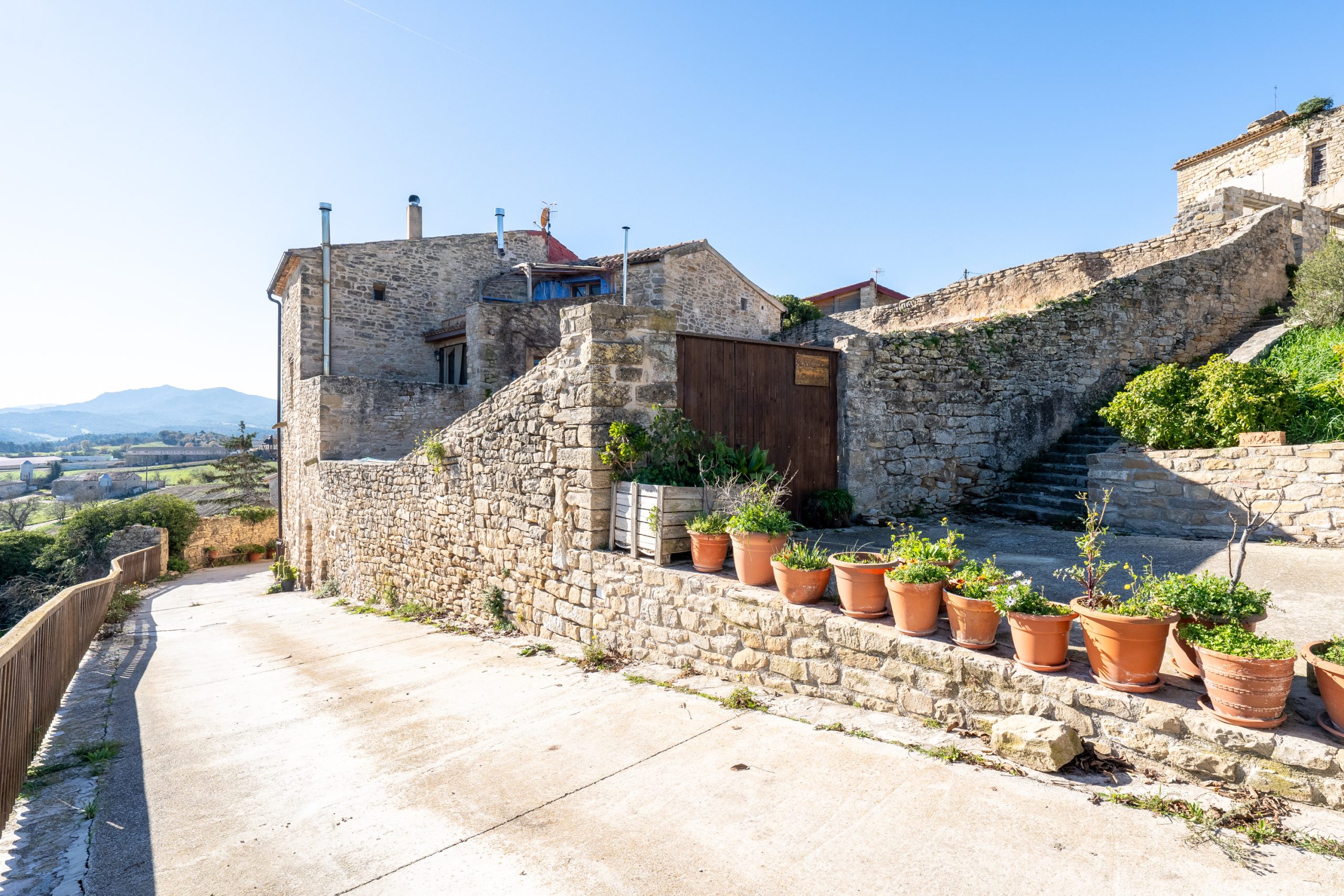 La calle Mayor es el acceso principal, entramos por un recibidor distribuidor con un suelo de piedra de río de canto redondo, aquí encontramos la sala de estar-comedor y una terraza que da a ponente, dos habitaciones con baño, al fondo una cocina con su antigua pica de piedra, y un espacio donde está la entrada de la antigua cisterna y el horno de pan convertido en terracita, ya que lo encontramos totalmente derruido.