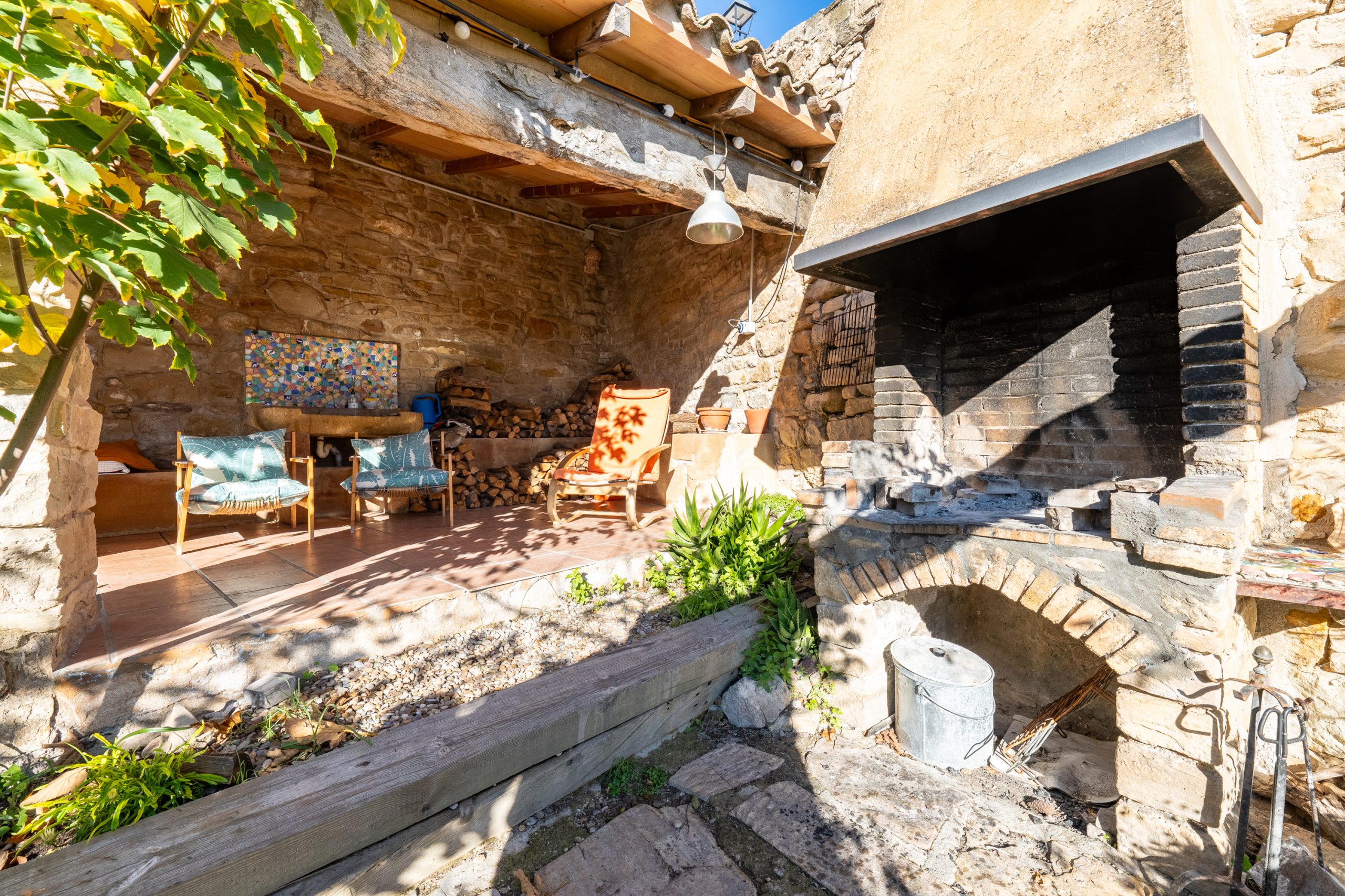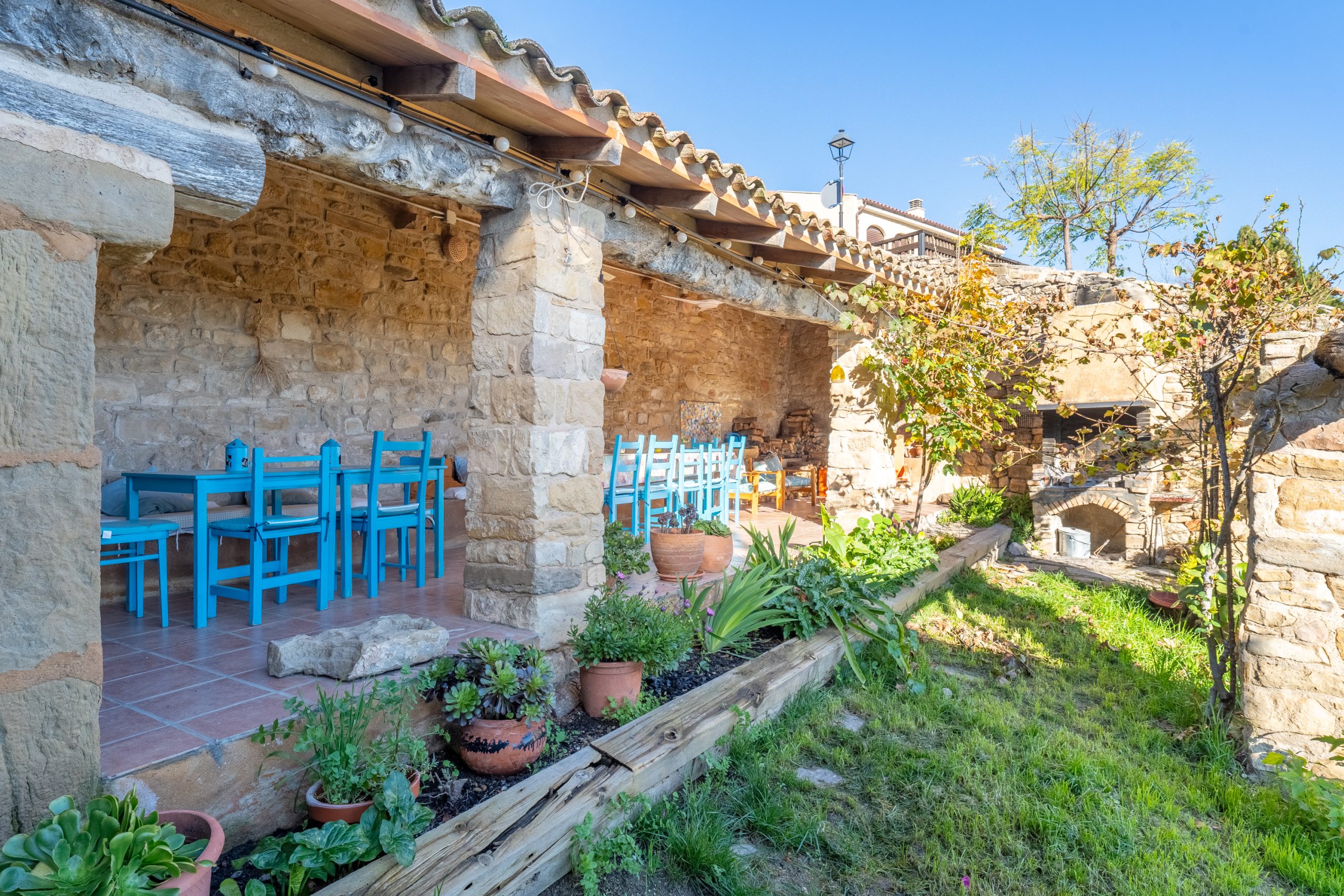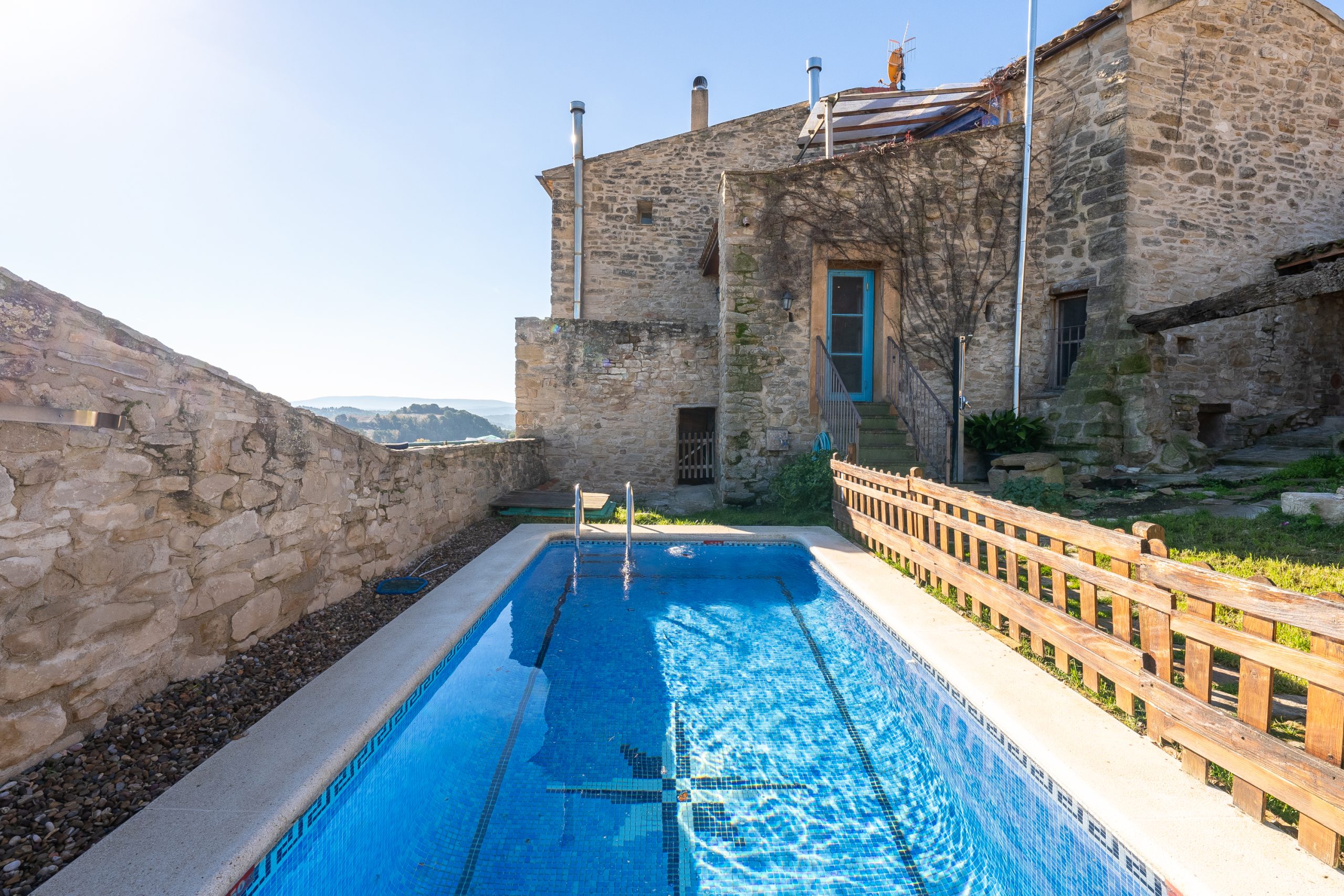 Desde aquí a través de una puerta con llave bajamos unas escaleras que nos llevan a un jardín envuelto por un muro de piedra, el cual hemos bajado un poco para que se vea desde dentro el paisaje. En este espacio tenemos la piscina, una barbacoa y un porche cubierto, ideal para cenas, lecturas y para el descanso en general.